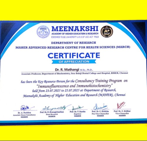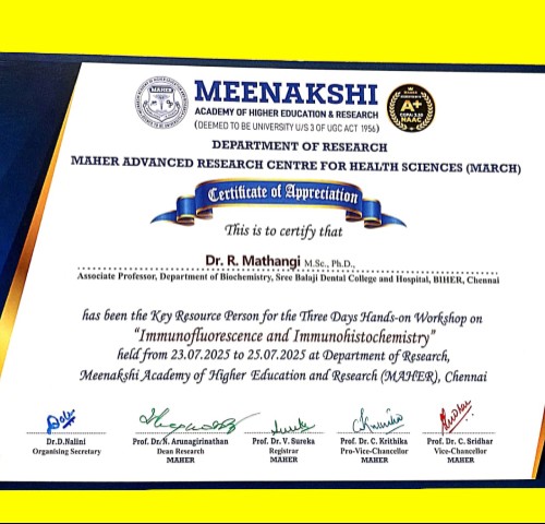 The Central Research Laboratory, Department of Research, Meenakshi Academy of Higher Education and Research (MAHER), successfully conducted a Three-Day Hands-on Workshop on Immunofluorescence and Immunohistochemistry from 23rd to 25rd July 2025 at No.12, Vembuliamman Koil Street, West K.K. Nagar, Chennai – 600 078.
