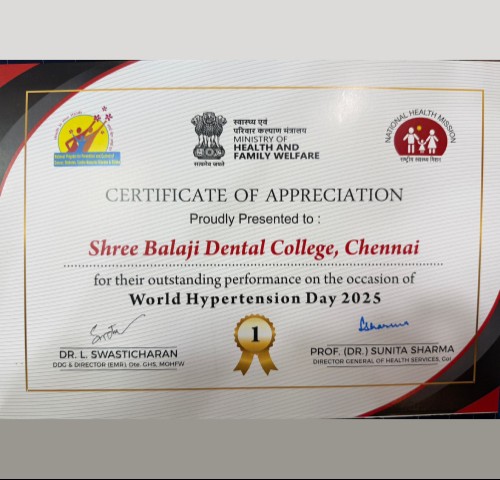 Sree Balaji Dental College & Hospital, Chennai, has been recognized by the Ministry of Health & Family Welfare, Government of India, as a “Performing College” for its significant contribution to creating national awareness on hypertension among the community.