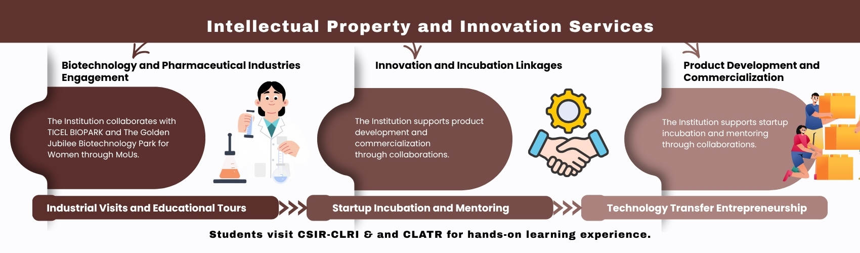 The objective to visit TICEL Bio Park for an Intellectual Property visit was to explore its role as a biotechnology and life sciences hub that fosters innovation, entrepreneurship, and commercialization of research. The visit focused on understanding how the park supports IPR-driven activities, such as patenting new biotechnologies, protecting intellectual property for its resident companies and startups, and facilitating the translation of research into market-ready products.
