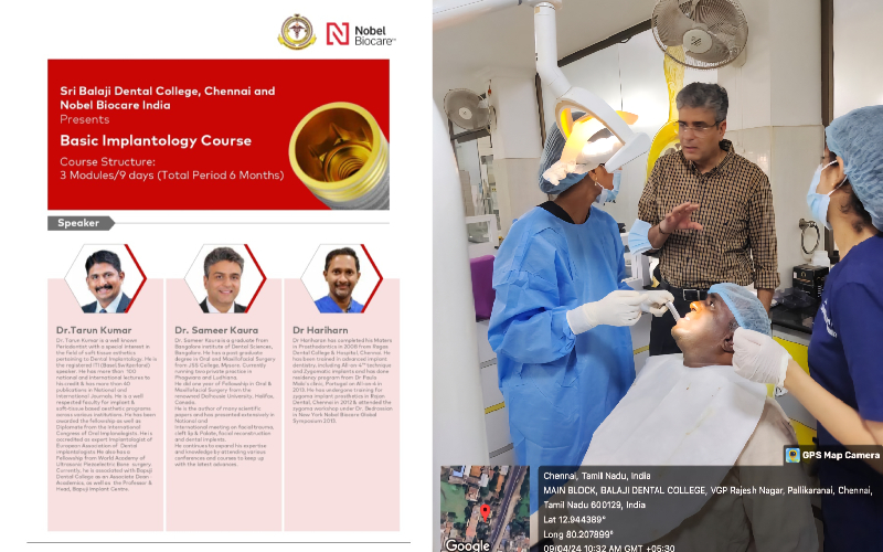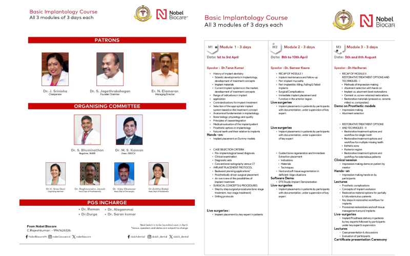 The Department of Prosthodontics in collaboration with Nobel Biocare India, conducted a Basic Implantology Course designed to enhance clinical skills and knowledge in implant dentistry. The program was structured into three modules across nine days over a period of six months, combining theory with practical training. Esteemed speakers Dr. Tarun Kumar, Dr. Sameer Kaura, and Dr. Hariharan guided participants through the fundamentals of implantology, offering valuable insights and hands-on experience. The course reinforced the institution’s commitment to academic excellence, professional development, and advancing clinical practice in modern dentistry.