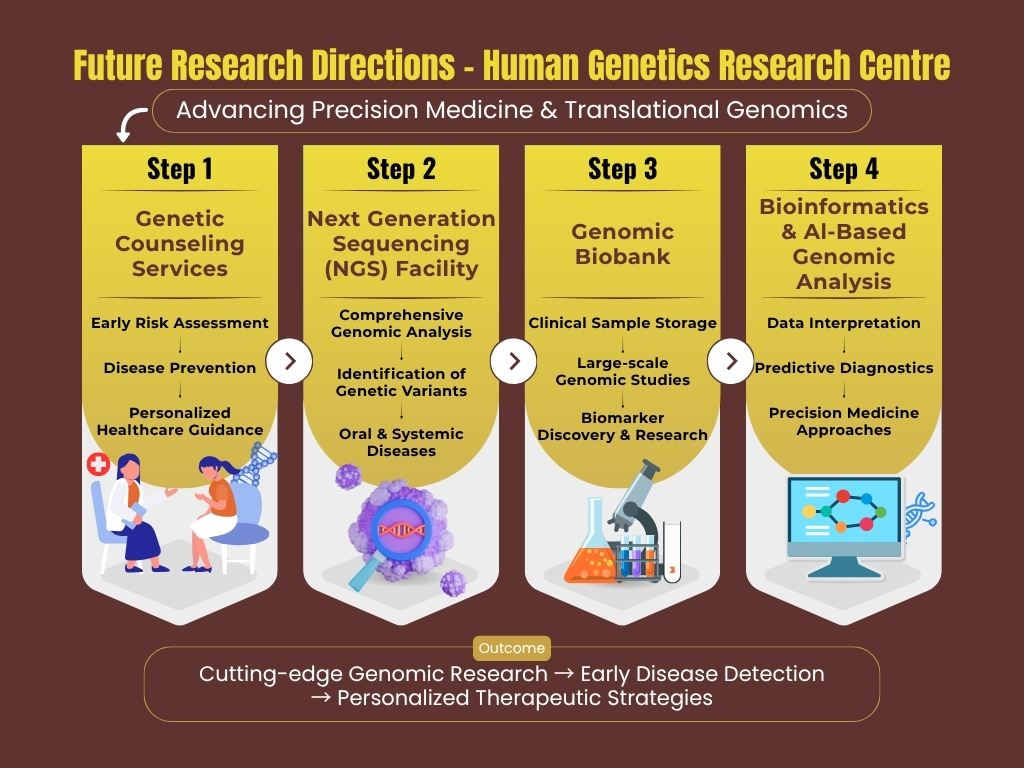 The Human Genetics Research Centre is strategically advancing toward the future of precision medicine through a structured, multi-step approach. Beginning with genetic counseling services, the focus is on early risk assessment, disease prevention, and personalized healthcare guidance. The next phase involves establishing a Next Generation Sequencing (NGS) facility to enable comprehensive genomic analysis and accurate identification of genetic variants associated with oral and systemic diseases.