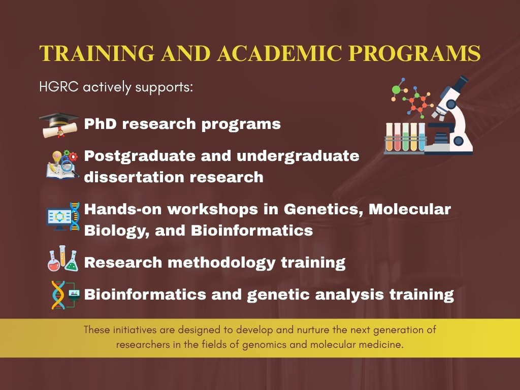 HGRC conducts hands-on workshops in Genetics, Molecular Biology, and Bioinformatics, offering practical exposure to modern laboratory techniques and analytical tools. In addition, specialized research methodology training programs are designed to strengthen scientific writing, experimental design, and data interpretation skills.